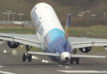 Az Emirates légitársaság Airbus A380-800-as óriásgépe a földetérést követően szinte szlalomozott az erős széllökések és a pilóták korrekciós oldalkormányzása hatására. Lélegzetelállító felvételek!