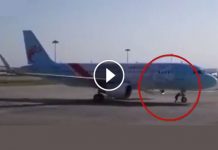 Rövid videó, ahogy a reptéri dolgozó egy féktuskóval állítja meg az üresen hátraguruló repülőgépet egy ismeretlen kínai reptéren.
