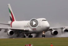 Mutatunk néhány szélestörzsű repülőgépet, ahogy fékezés közben a sugárfordítóval fújják a futópálya felületéről a vizet heves esőzést követően.