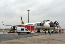 Rádőlt a német Condor légitársaság Airbus A321-esére egy fényvető torony a Schönefeld repülőtéren, miután a repülőgép vontatás közben a szárnyával nekiütközött.