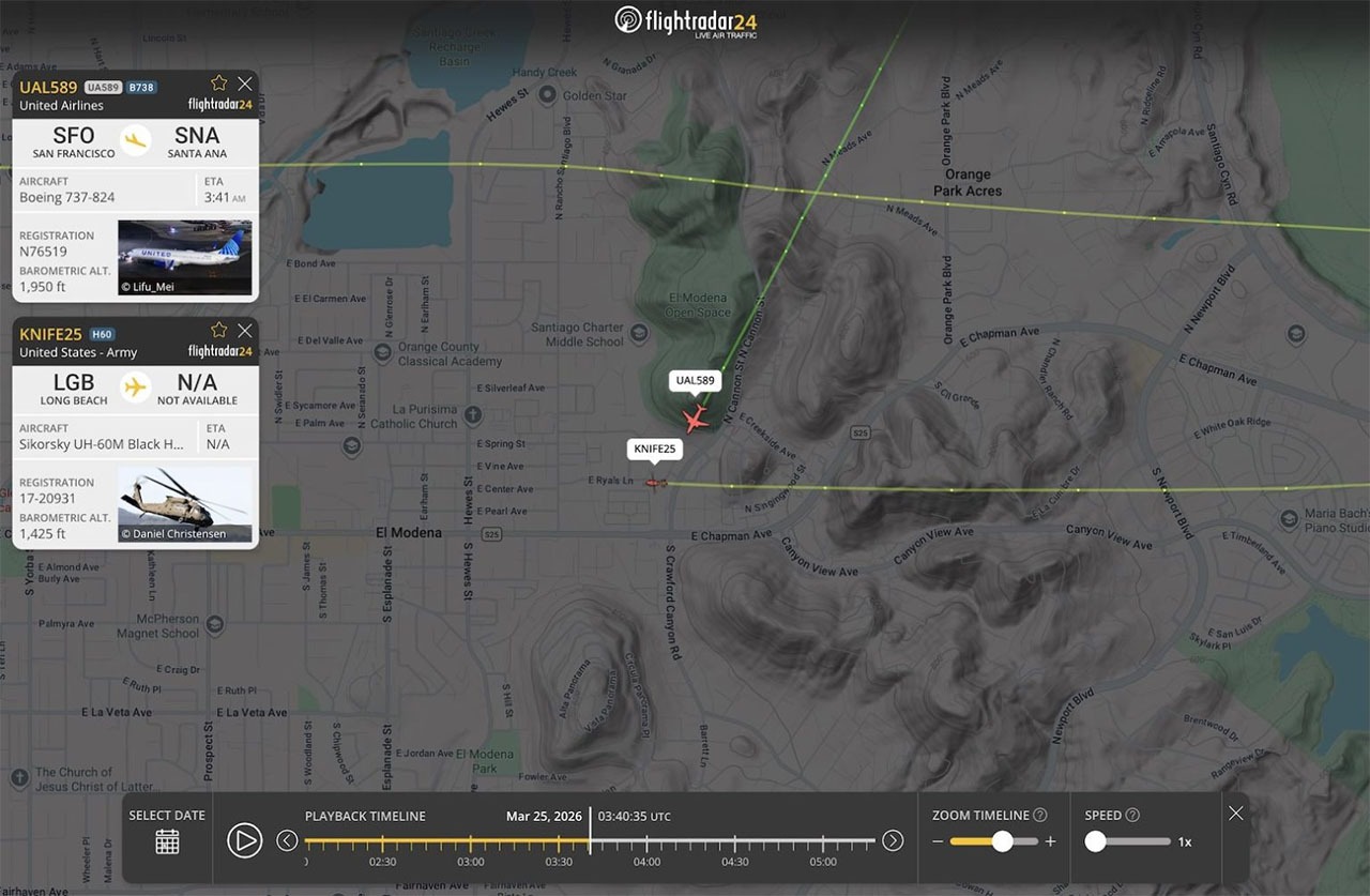 Vizsgálatot indított a Szövetségi Légügyi Hivatal (FAA), miután az USA hadserege által üzemeltetett egyik Sikorsky UH-60 Black Hawk helikopter keresztezte a United Airlines egyik Boeing 737-800 típusú repülőgépének útját, amely a John Wayne repülőtér megközelítését hajtotta végre március 24-én este – számolt be a Flightradar24.