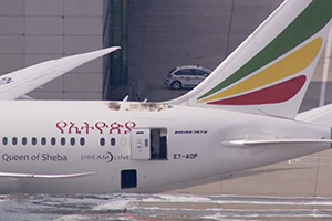 Tűz ütött ki egy földön parkoló etióp Boeing 787-es repülőgép fedélzetén pénteken, a törzs hátsó részének teteje átégett, komoly a kár.