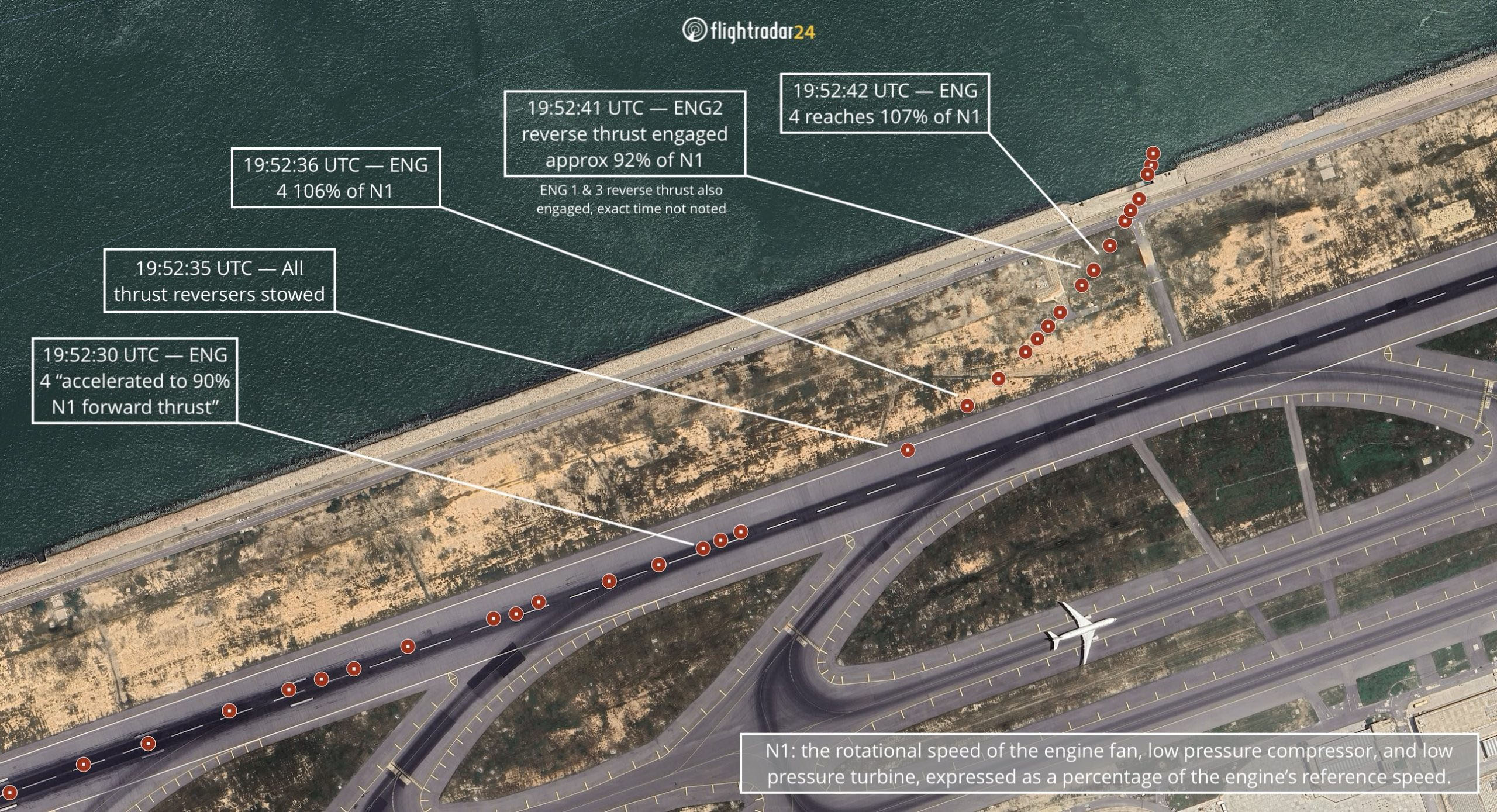 Ezzel egy időben a többi hajtóművön a korábban beállított sugárfordítót a személyzet visszahúzta alaphelyzetbe, majd újra aktiválta, de ekkorra a repülőgép már balra letért a futópályáról.