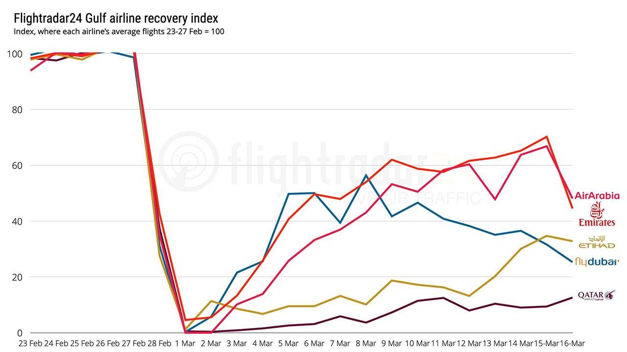 A légitársaság március közepére már elérte a február végi kapacitása több mint 60 százalékát, amely az incidens után, hétfőn 40 százalék közelébe zuhant vissza. (A visszaesés jelentős mértékben érintette a diszkont légitársaságokat, a Flydubai-t és az Air Arabiát is.)