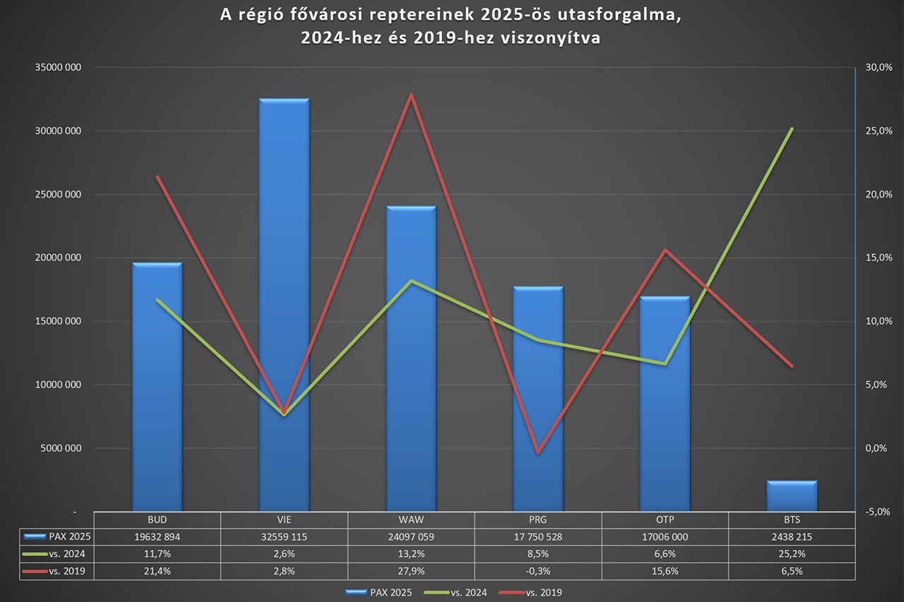 Az adatokat összehasonlítva a magyar főváros repülőtere a harmadik legnagyobb lett a régiós fővárosok között, Bécs és Varsó után.